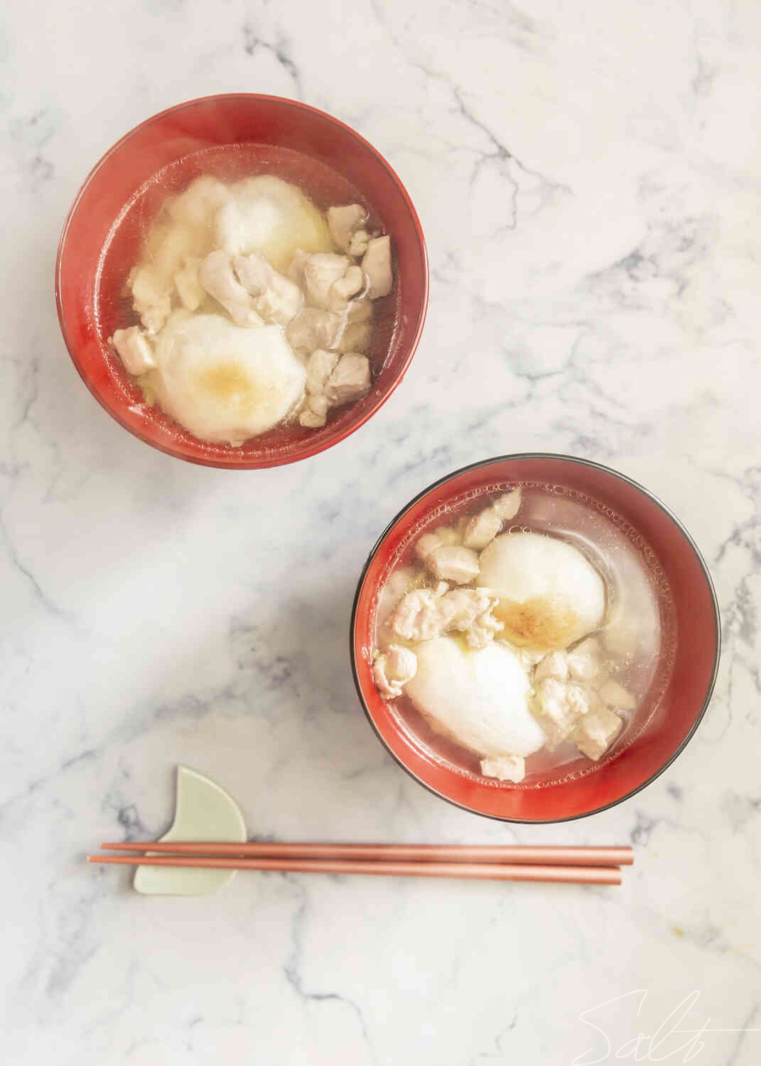 Each region in Japan has their own type of Ozouni. In the west part of Japan, which is where I’m from, you’ll typically see white miso being used. Our family, however, uses clear soup with a fish stock base called Dashi. We mix our dashi base with a second broth, made from chicken thigh. This soup is very comforting and reminds me of my childhood in Osaka.